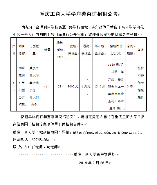 学府苑内1号门面公开招租结果公告