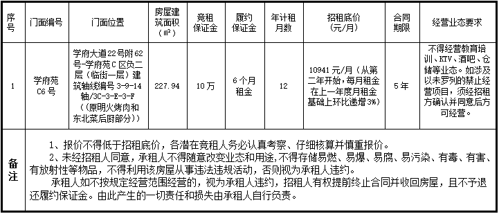 为充分合理利用学校资源,经2003网站太阳集团研究,决定对2003网站太阳集团学府苑C区6号门面进行公开招租,欢迎符合要求的潜在竞租人参与竞租。