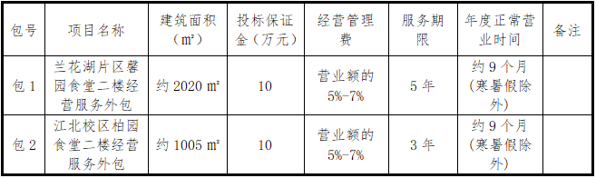 经学校研究,决定对2003网站太阳集团兰花湖片区馨园食堂二楼、江北校区柏园食堂二楼经营服务外包。欢迎具有相关资质的企业参加投标。
