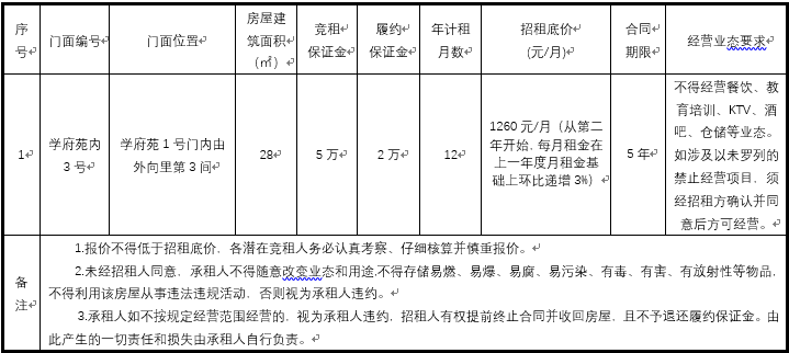 为充分合理利用学校资源,经2003网站太阳集团研究,决定对2003网站太阳集团学府苑内3号门面进行公开招租,欢迎符合要求的潜在竞租人参与竞租。