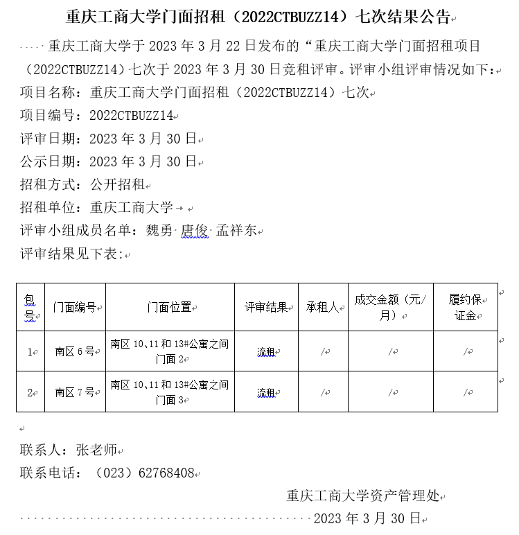 2003网站太阳集团门面招租(2022CTBUZZ14)七次结果公告
