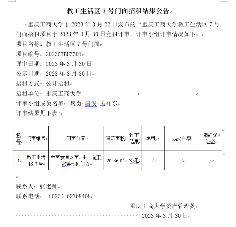 教工生活区7号门面招租结果公告