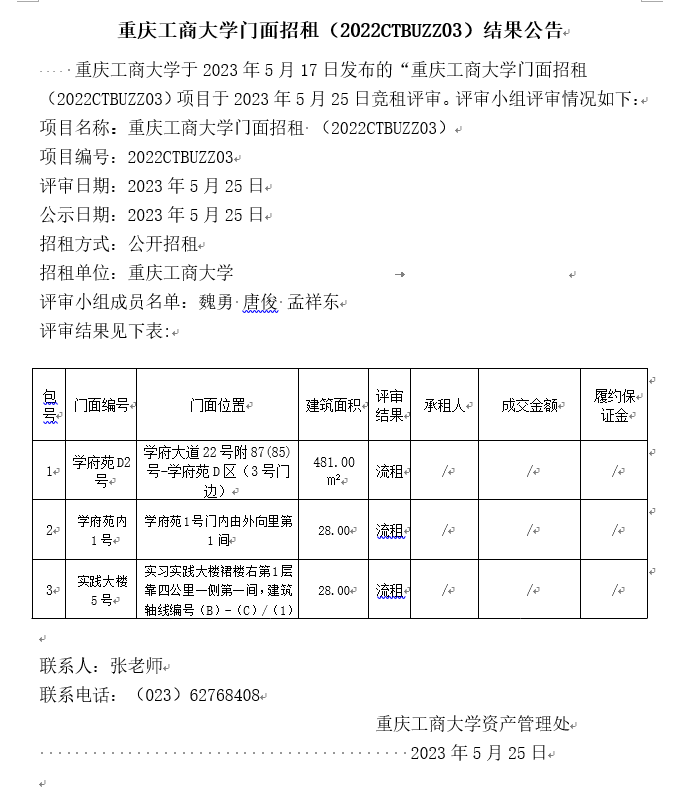 2003网站太阳集团门面招租(2023CTBUZZ04)结果公告