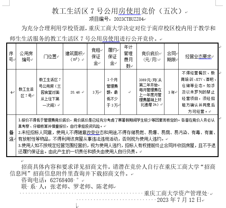 教工生活区7号公用房使用竞价(五次)