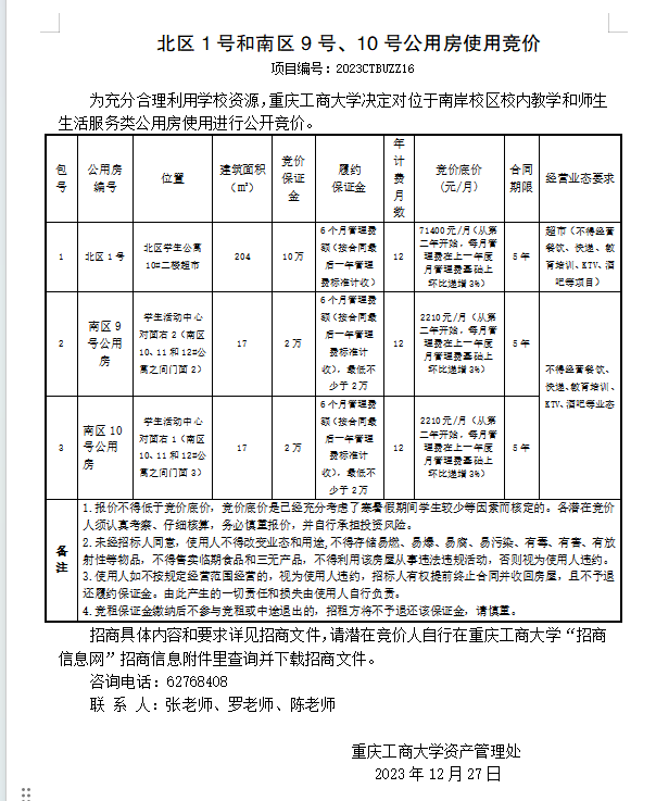 北区1号和南区9号、10号公用房使用竞价