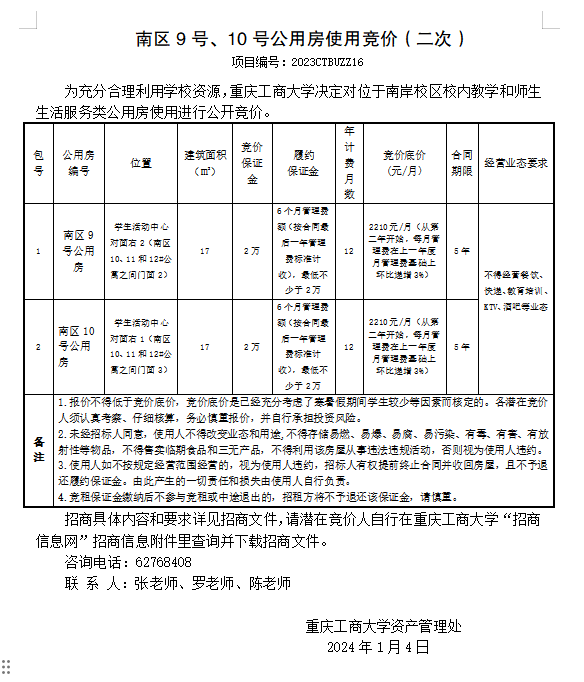 北区1号和南区9号、10号公用房使用竞价