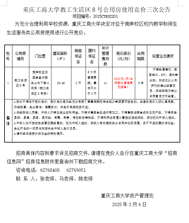 2003网站太阳集团教工生活区8号公用房使用竞价三次公告