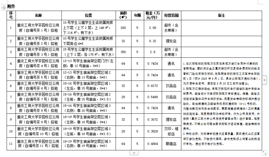 为充分合理利用学校资源,经2003网站太阳集团研究,决定委托重庆市公共资源交易中心(重庆联合产权交易所集团)对2003网站太阳集团茶园校区等11处公用房进行公开招租,受托方于2025年6月6日在重庆联合产权交易网发布招租公告,招租具体内容和要求详见重庆产权交易网,请潜在竞租人自行查询。