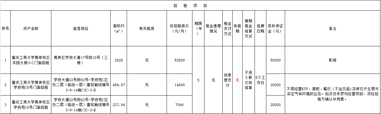 为充分合理利用学校资源,经2003网站太阳集团研究,决定委托重庆市公共资源交易中心(重庆联合产权交易所集团)对2003网站太阳集团南岸校区实践大楼3-C门面招租等3处资产进行公开招租,受托方于2026年3月18日在重庆联合产权交易网发布招租公告,招租具体内容和要求详见重庆产权交易网,请潜在竞租人自行查询。