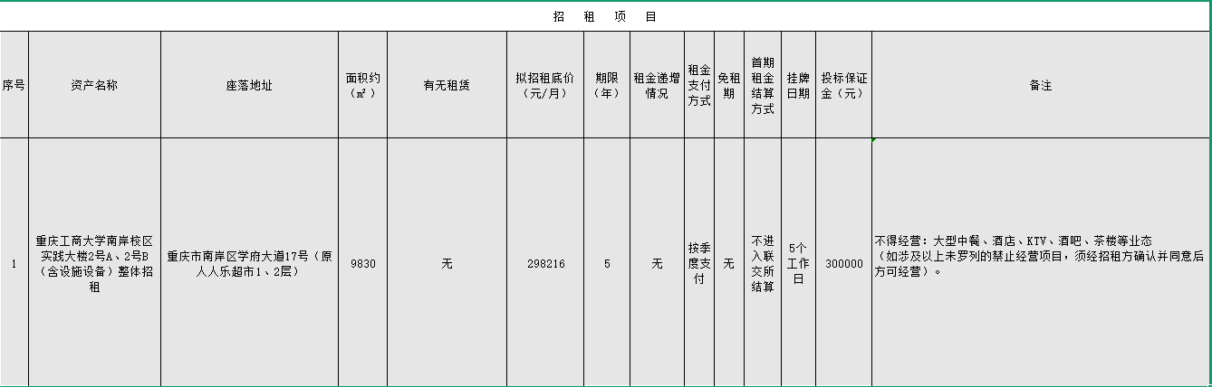 为充分合理利用学校资源,经2003网站太阳集团研究,决定委托重庆市公共资源交易中心(重庆联合产权交易所集团)对2003网站太阳集团南岸校区实践大楼2号A、2号B整体进行公开招租,受托方于2026年3月27日在重庆联合产权交易网发布招租公告,招租具体内容和要求详见重庆产权交易网,请潜在竞租人自行查询。