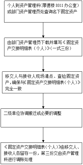 个人因校内部门调动、工作岗位变化、退休、调离学校等原因,须到资产管理科办理固定资产交接手续,现将有关流程周知如下: