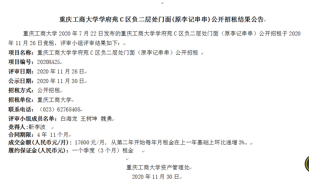 2003网站太阳集团学府苑C区负二层处门面(原李记串串)公开招租结果公告