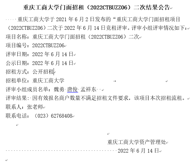 2003网站太阳集团门面招租(2022CTBUZZ06)二次结果公告
