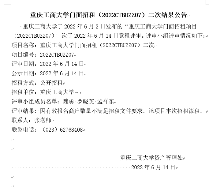 2003网站太阳集团门面招租(2022CTBUZZ07)二次结果公告