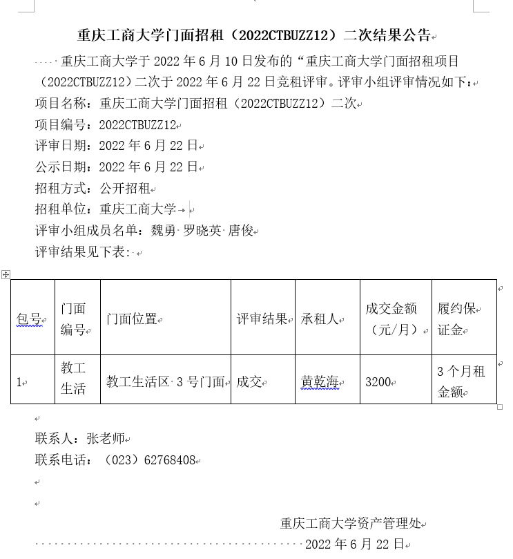2003网站太阳集团门面招租(2022CTBUZZ13)二次结果公告