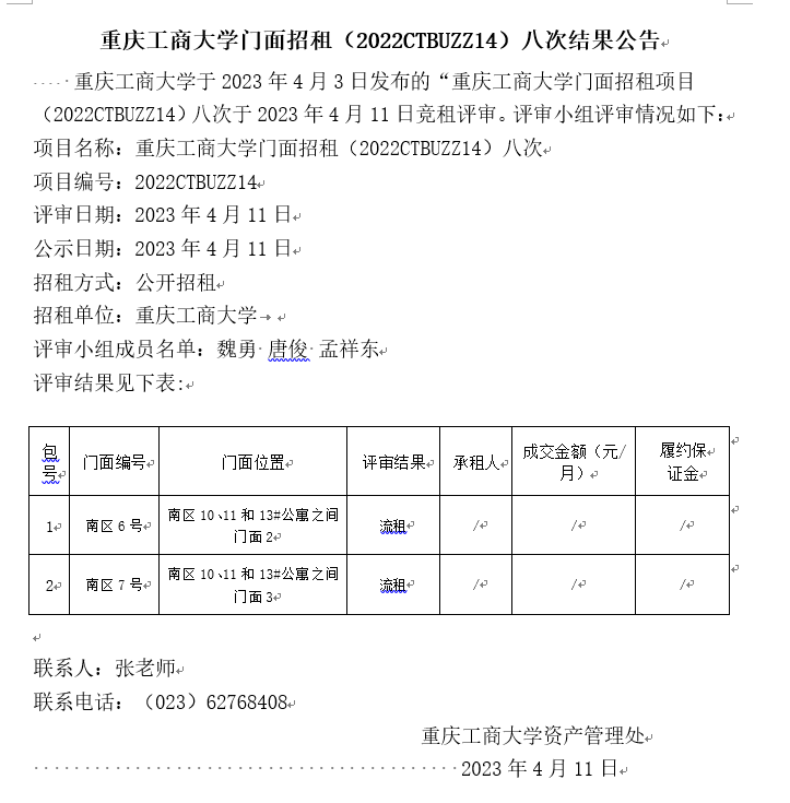 2003网站太阳集团门面招租(2022CTBUZZ03)十四次结果公告