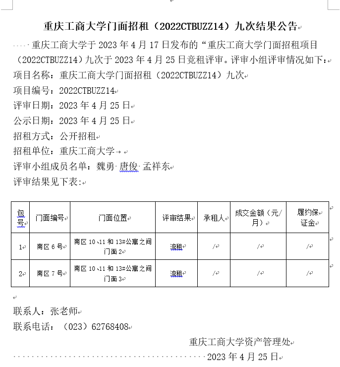 2003网站太阳集团门面招租(2022CTBUZZ14)九次结果公告