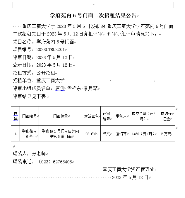 学府苑内6号门面二次招租结果公告