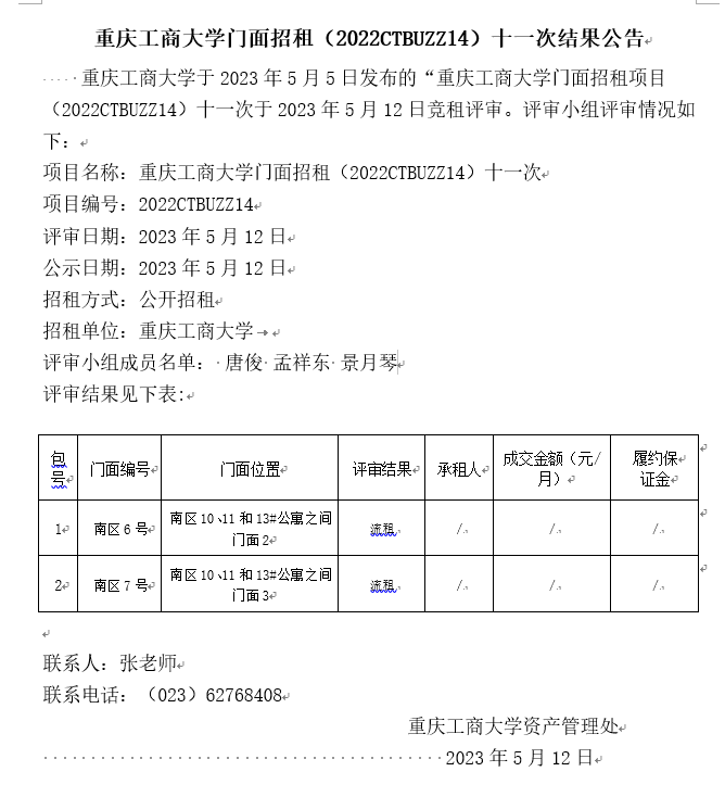 2003网站太阳集团门面招租(2022CTBUZZ14)十一次结果公告
