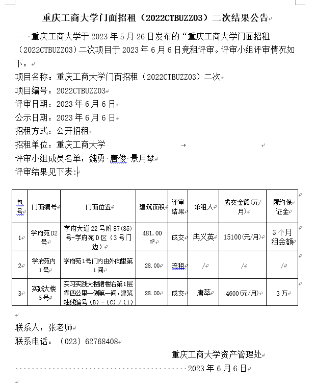 2003网站太阳集团门面招租(2023CTBUZZ05)二次结果公告