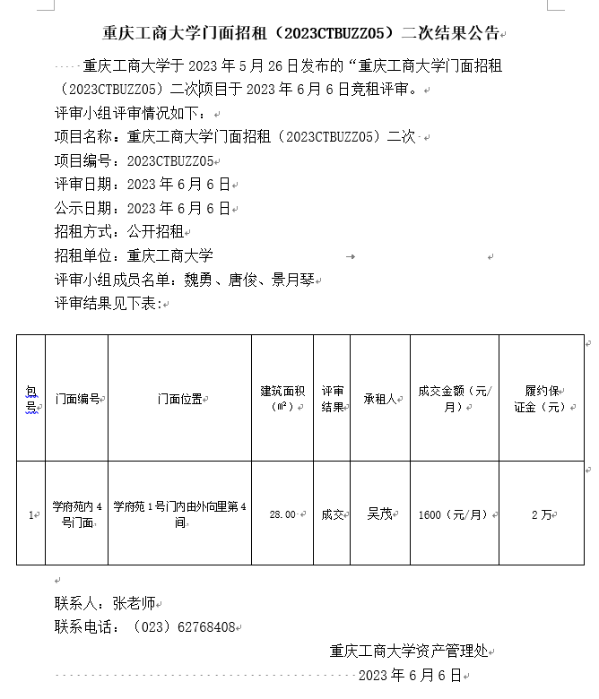 2003网站太阳集团门面招租(2023CTBUZZ05)二次结果公告