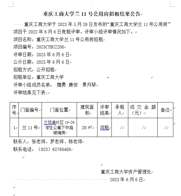 2003网站太阳集团门面招租(2023CTBUZZ05)二次结果公告