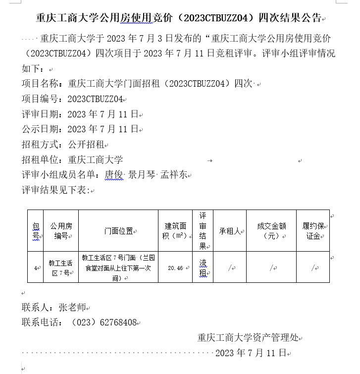 2003网站太阳集团公用房使用竞价(2023CTBUZZ04)四次结果公告