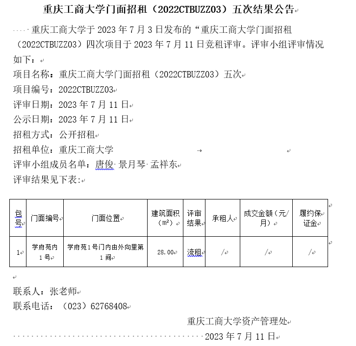 2003网站太阳集团门面招租(2022CTBUZZ08)二次结果公告