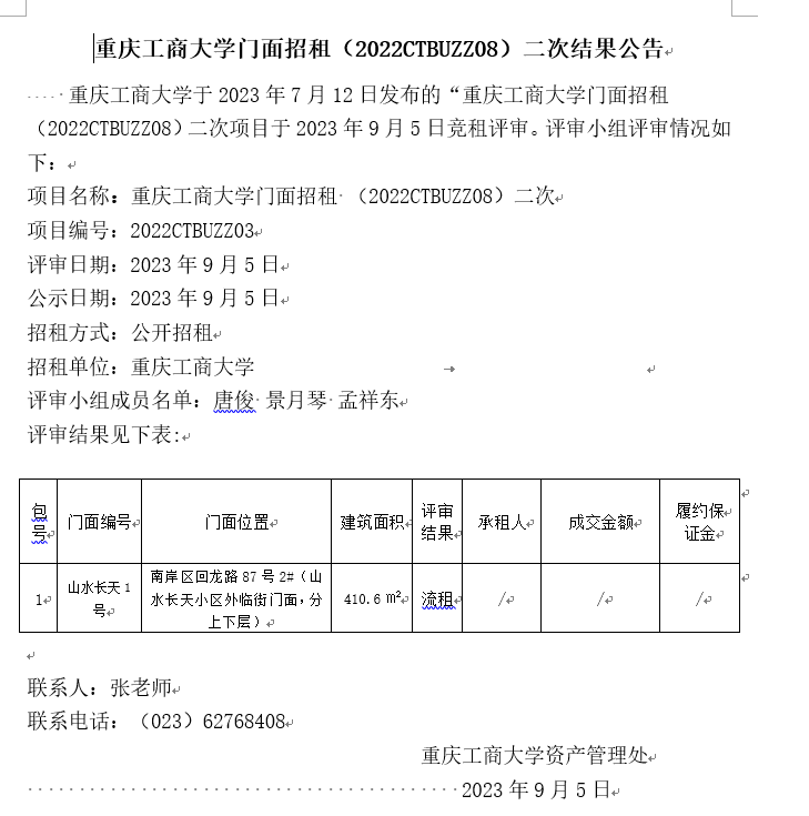 2003网站太阳集团门面招租(2022CTBUZZ08)二次结果公告