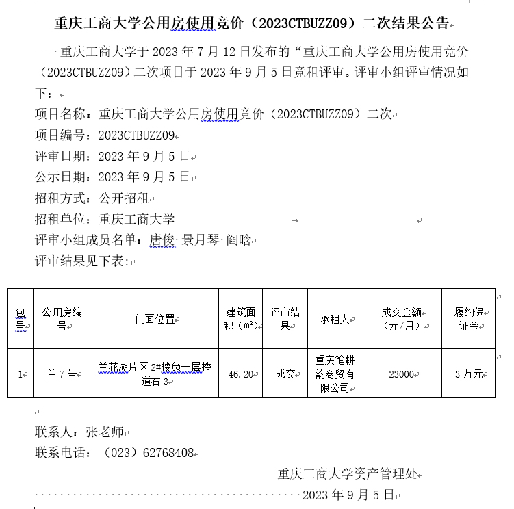 2003网站太阳集团公用房使用竞价(2023CTBUZZ09)二次结果公告