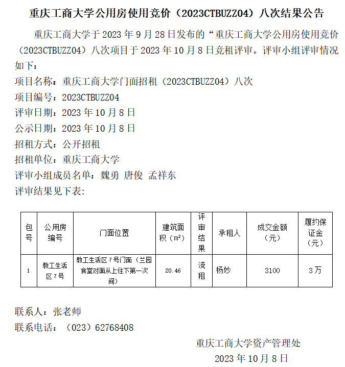 2003网站太阳集团公用房使用竞价(2023CTBUZZ04)八次结果公告