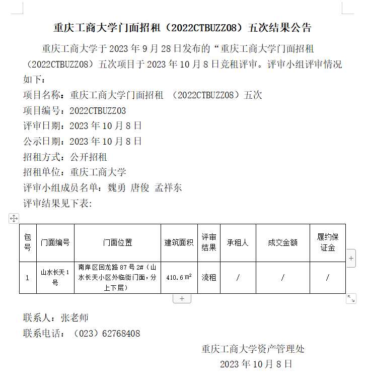 2003网站太阳集团门面招租(2022CTBUZZ08)五次结果公告