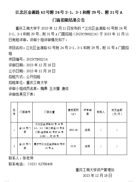 江北区金源路62号附24号2-1、3-1和附29号、附31号A 门面招租结果公告