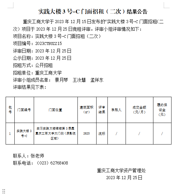 实践大楼3号-C门面招租(二次)结果公告