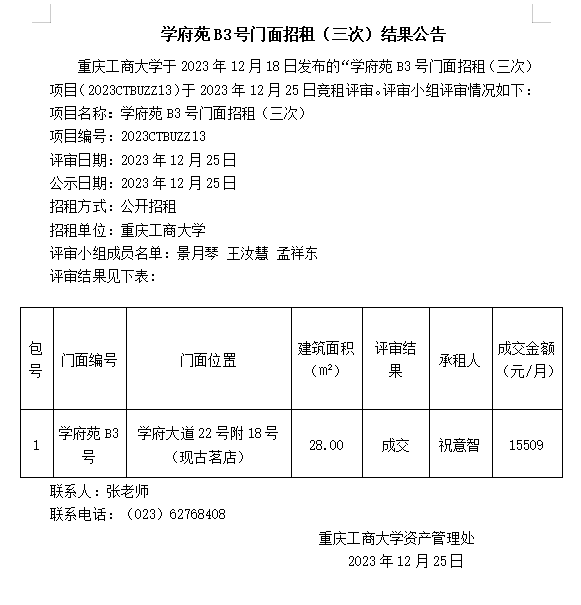 北区1号和南区9号、10号公用房使用竞价结果公告