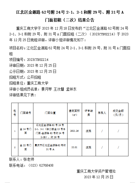 江北区金源路62号附24号2-1、3-1和附29号、附31号A 门面招租(二次)结果公告