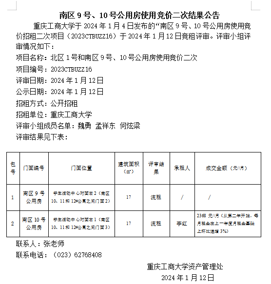 南区9号、10号公用房使用竞价二次结果公告