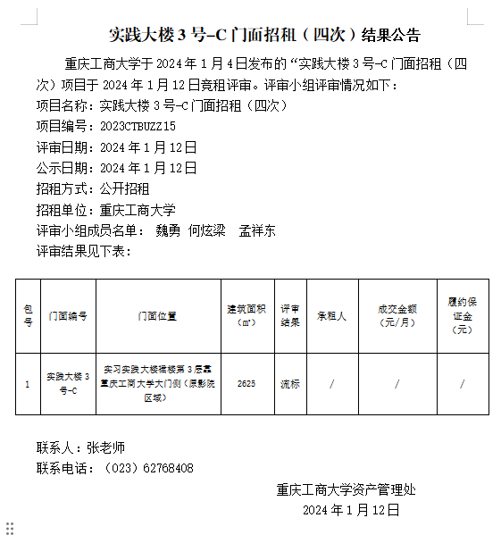 实践大楼3号-C门面招租(四次)结果公告