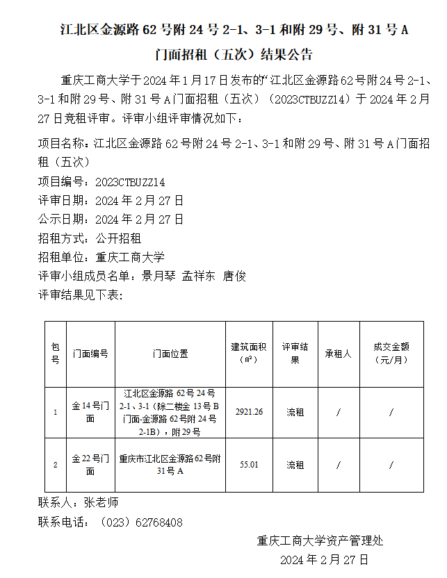 江北区金源路62号附24号2-1、3-1和附29号、附31号A 门面招租(五次)结果公告