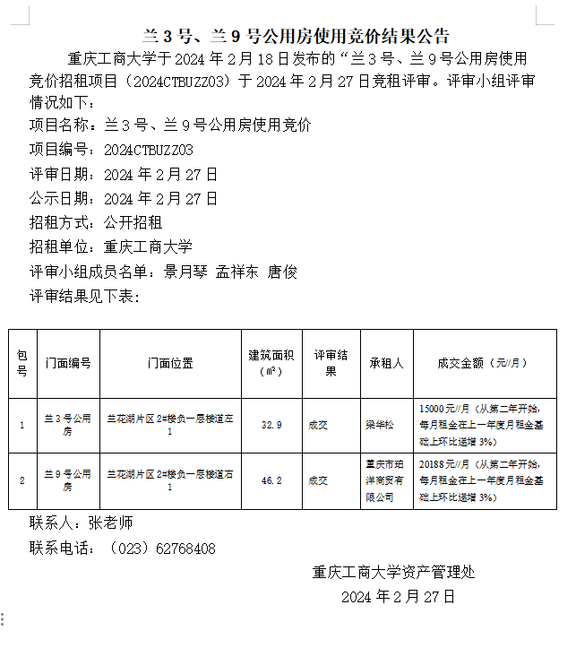 兰3号、兰9号公用房使用竞价结果公告