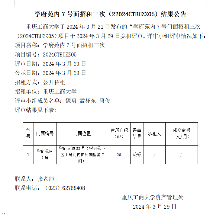 学府苑内7号面招租三次(22024CTBUZZ05)结果公告