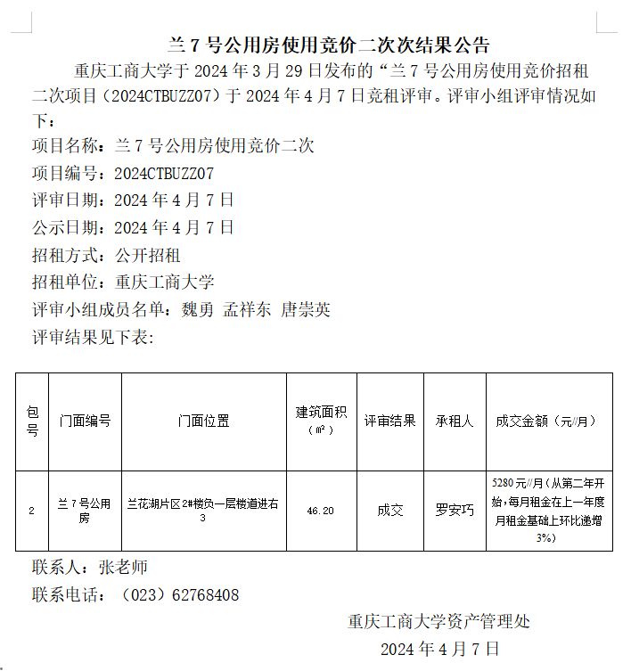 学府苑内7号面招租四次(22024CTBUZZ05)结果公告