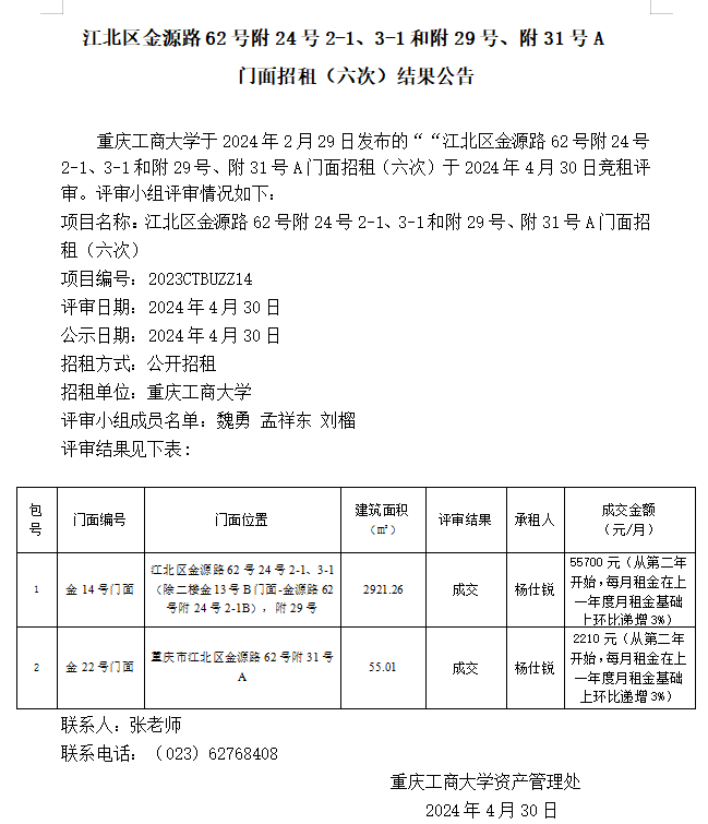 江北区金源路62号附24号2-1、3-1和附29号、附31号A 门面招租(六次)结果公告
