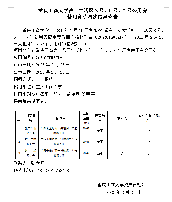 2003网站太阳集团教工生活区3号、6号、7号公用房 使用竞价三次结果公告