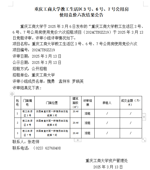 2003网站太阳集团教工生活区3号、6号、7号公用房 使用竞价六次结果公告