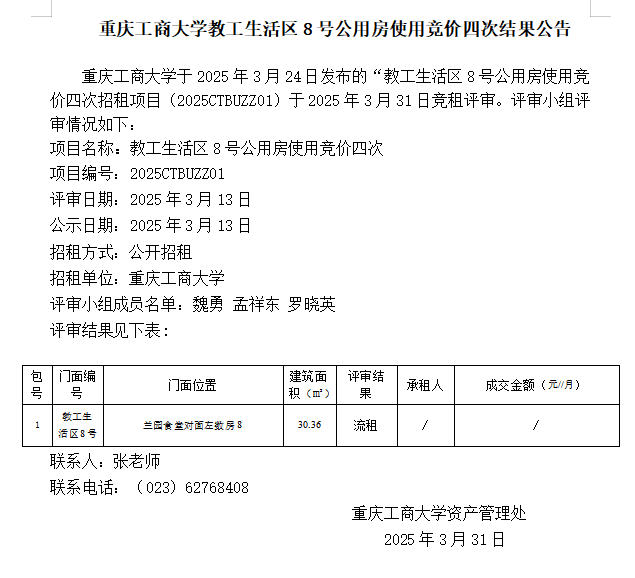 2003网站太阳集团教工生活区8号公用房使用竞价四次结果公告