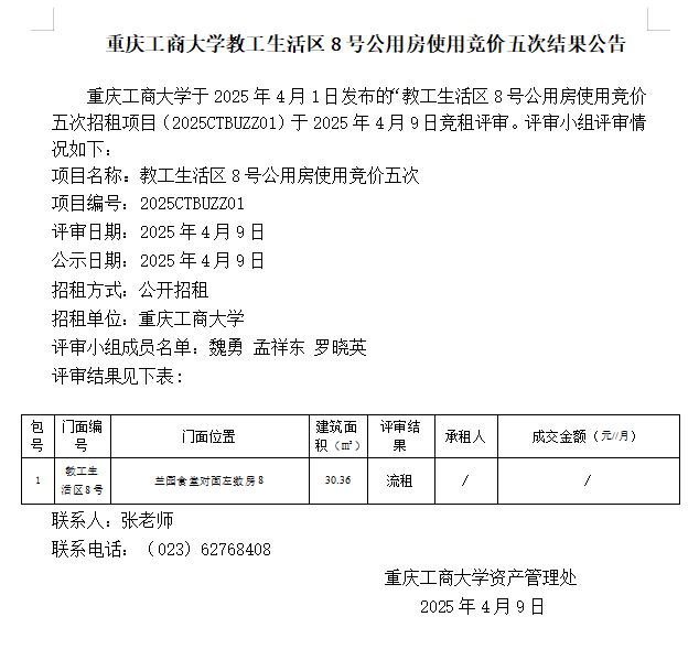 2003网站太阳集团教工生活区8号公用房使用竞价五次结果公告