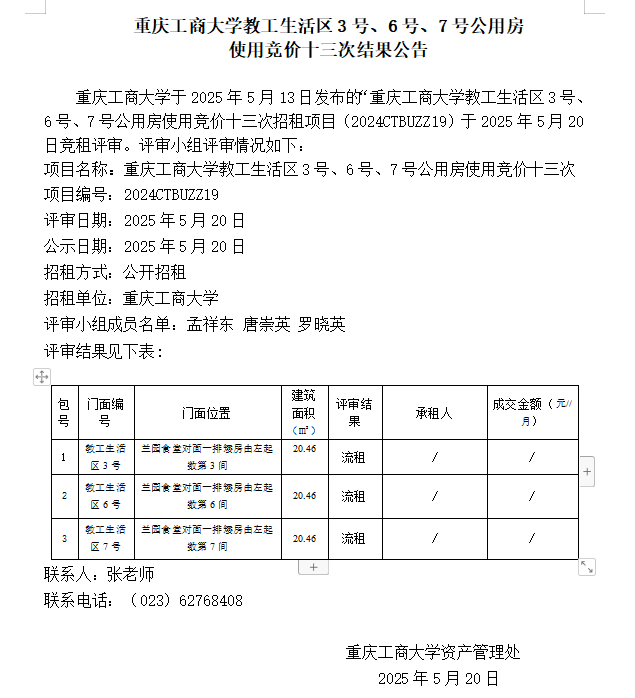 2003网站太阳集团教工生活区3号、6号、7号公用房 使用竞价十二次结果公告