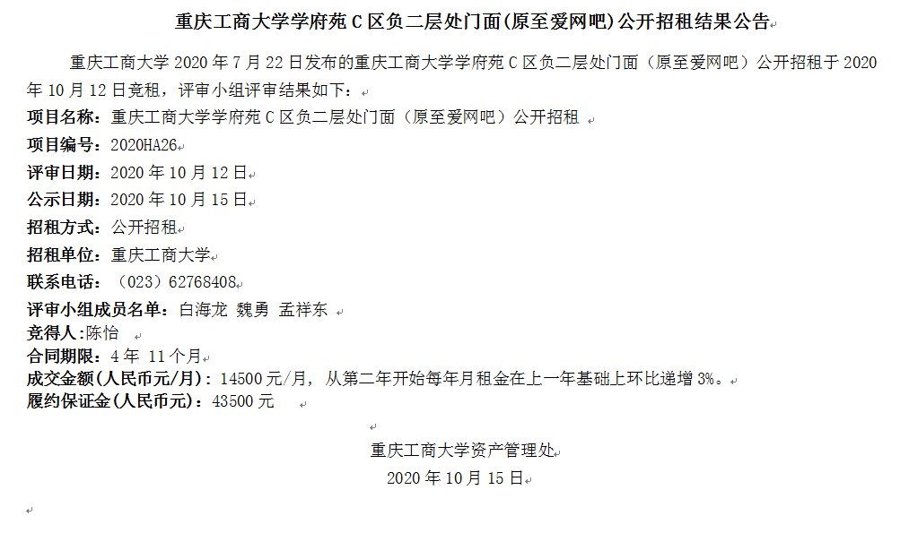2003网站太阳集团学府苑C区负二层处门面(原至爱网吧)公开招租结果公告